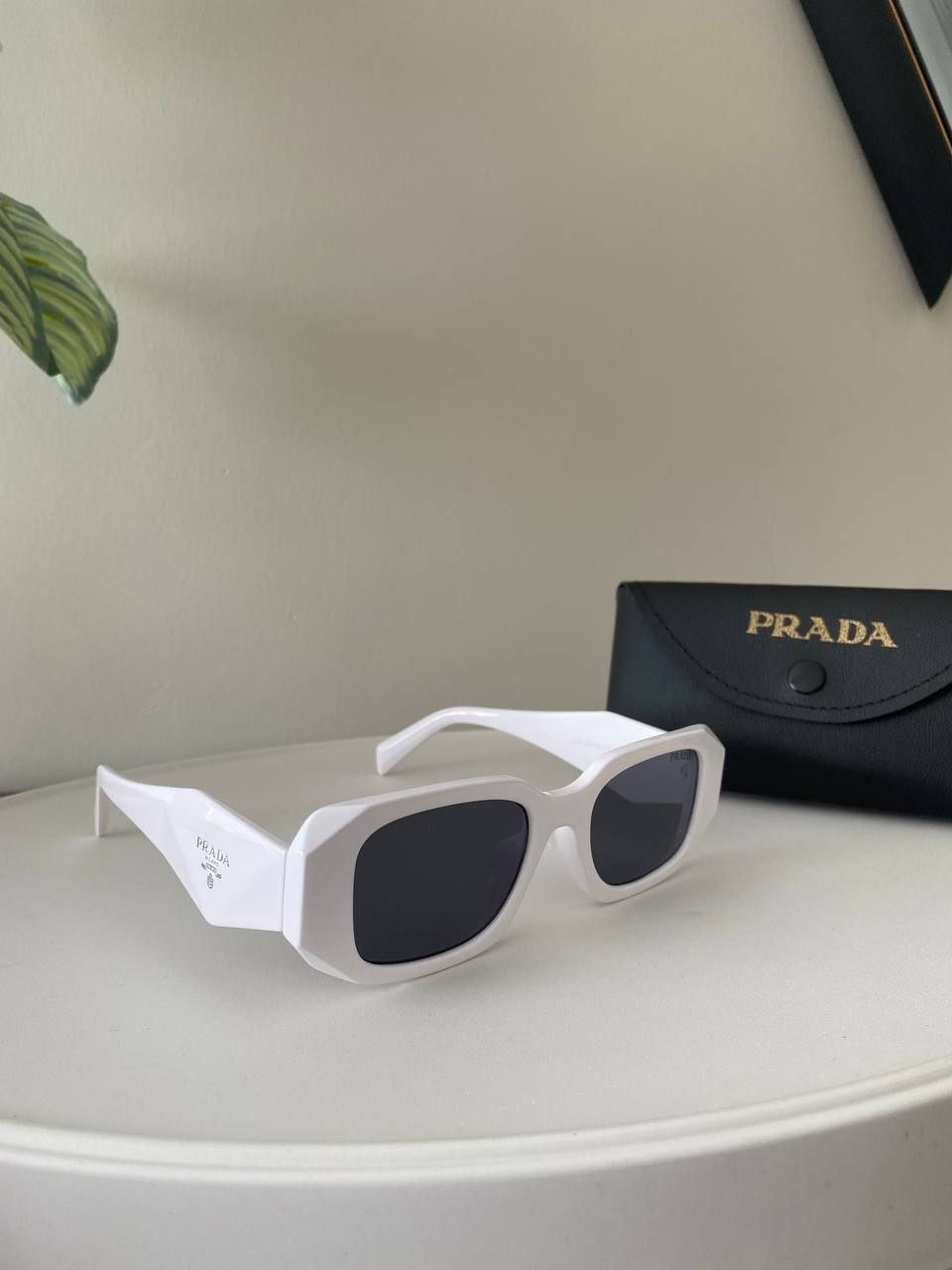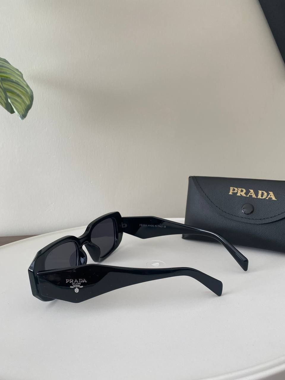 العلامة المميزة: شعار مثلث برادا الشهير (Prada Triangle) المحفور بأسلوب بارز على الأذرع الجانبية العريضة.